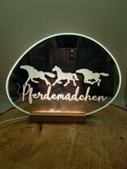 "Dieser wunderschöne, personalisierte Spiegel zeigt drei galoppierende Pferde und das Wort 'Pferdemädchen' in eleganter Schrift. Der Spiegel ist von einem sanften Licht umrahmt, das eine warme und einladende Atmosphäre schafft. Perfekt für alle Pferdeliebhaberinnen, die ihre Leidenschaft stilvoll zum Ausdruck bringen möchten. Ein einzigartiges Dekorationsstück, das jedes Zimmer verschönert und die Liebe zu Pferden widerspiegelt.