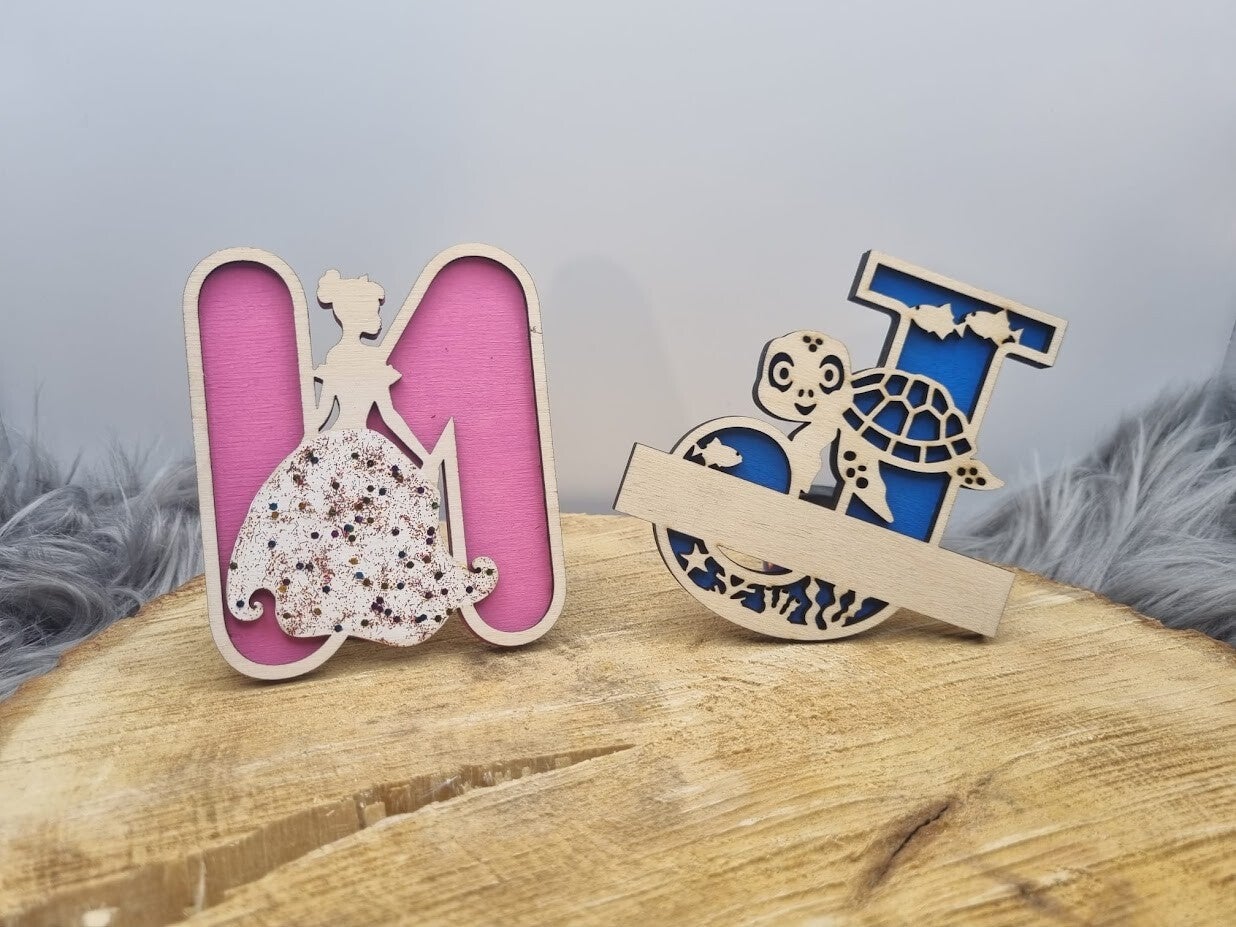 Unsere dekorativen Buchstaben "M" und "J" sind echte Hingucker. Der Buchstabe "M" strahlt in einem sanften Rosa und ist mit einer glitzernden Prinzessin verziert, die kleinen Träumern Freude bereitet. Der Buchstabe "J" hingegen besticht mit einem erfrischenden Blau und entzückt durch süße Darstellungen einer Schildkröte und eines Fisches – perfekt für kleine Meeresentdecker.